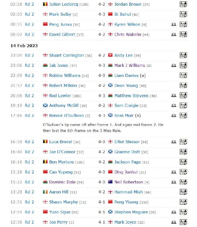 2023斯诺克威尔士公开赛正赛第2比赛日饱和赛果: